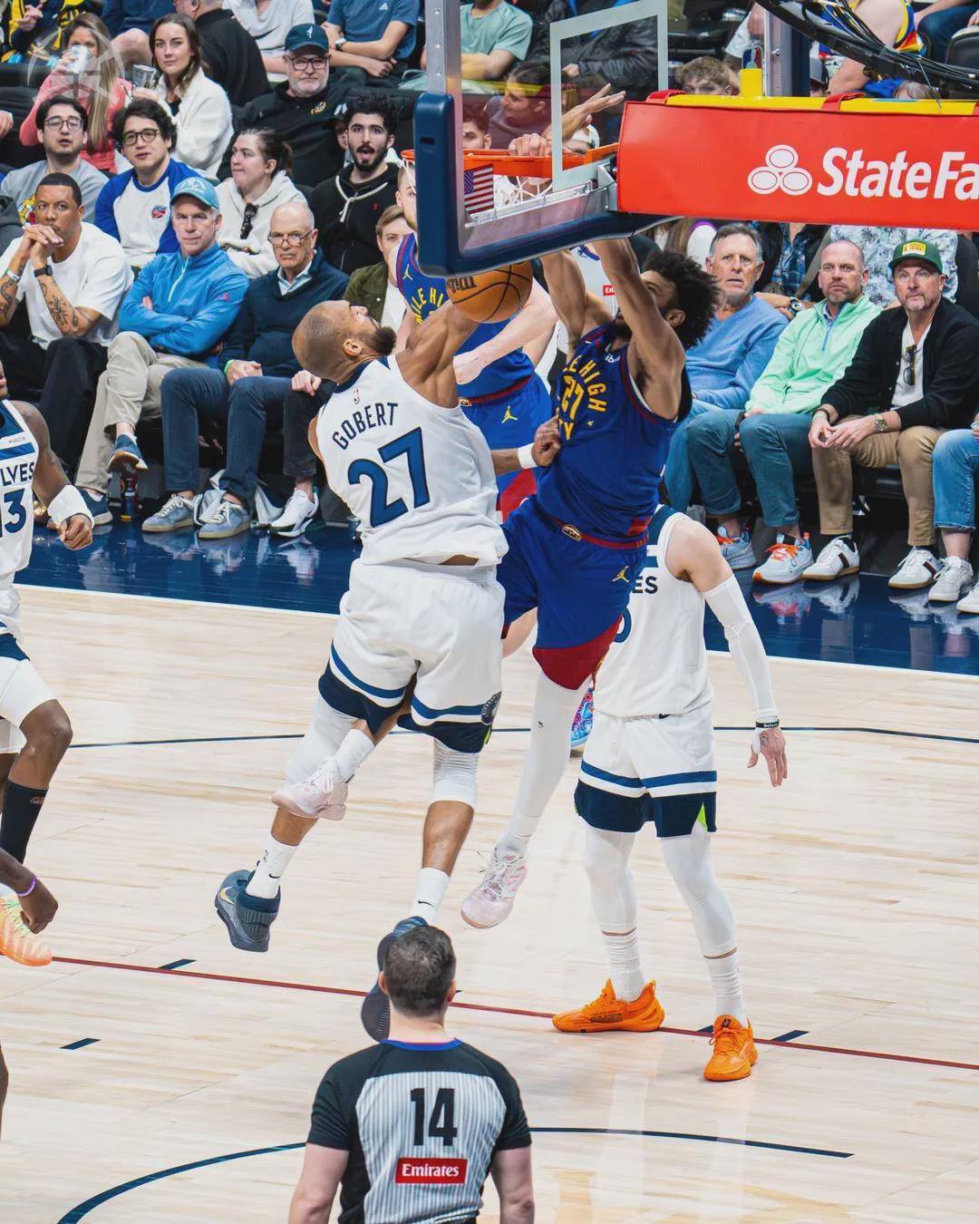 掘金的防守核心逻辑是约基奇蹲守禁区+外围单兵围剿。戈登是这个体系中唯一能从1号位防到5号位的球员。